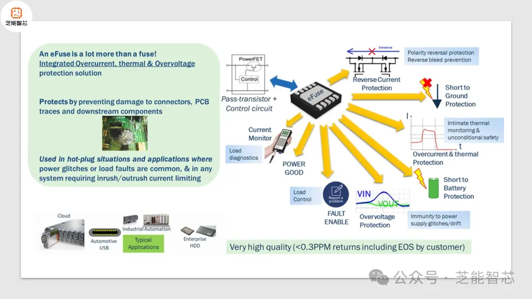 e-Fuse的工作原理是利用功率半導體MOSFET(或者IGBT等)和一個檢測電阻器,通過監控電壓實現對電路的保護。它可以與16位MCU等芯片配合,實現編程控制、監控和診斷功能。在電路發生過載或短路時,e-Fuse能夠快速切斷電流路徑,保護電路免受損壞。