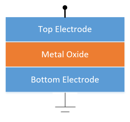 作為結構最簡單的存儲技術,它看上去像一個三明治,絕緣介質層(阻變層)被夾在兩層金屬之間,形成由上、下電極和阻變層構成金屬-介質層-金屬( metal-insulator-metal ,簡稱 MIM)三層結構。
