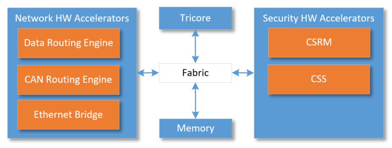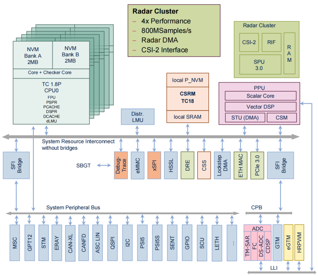 針對上述場景,TC4x 從功能安全、信息安全、高速內部通信路由、內核等方面做了進一步提升,整體架構如下圖所示: