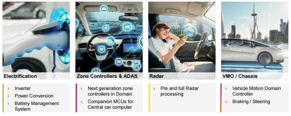 如今,英飛凌推出了新一代 AURIX? TC4x 系列。該系列采用新一代 TriCore? 1.8 內核,并引入了增強性能的加速器套件,包括并行處理單元(PPU),為人工智能和實時控制應用提供強大支持。主要面向電氣化領域(BMS、逆變器等)、區域控制、ADAS、底盤和車身控制領域,如下圖所示: