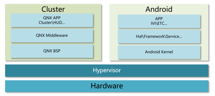 在汽車行業里,虛擬化的概念最先由座艙域引入,目的是在同一顆 SoC 上實現儀表和中控兩個系統的功能,在 Hypervisor 的管理下基本可以不修改舊代碼就可移植到最新的硬件上,如下圖: