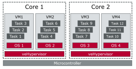 因此在汽車領域,由于對功能安全等級、實時性有較高要求,一般均使用 Type1 的 Hypervisor,Hypervisor 之上直接運行多個客戶操作系統 (GuestOS);