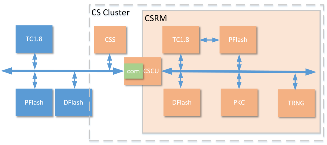 在 Cluster里,除 CSRM、CSS 外,還包括 TC1.8替代 TC3x中HSMM3內核、內部獨立的 PFlash 和DFlash,同時可以用過軟件配置各種外設成為 Cluster 里的部件,例如配置 Secure SPI與外部 TPM 交互。在 inSE的大背景下,該方案提升了 OEM\Tier 1 在布局汽車網絡安全的靈活性和可靠性。