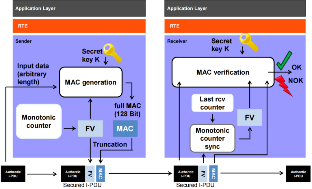 在 CP AUTOSAR 中,基礎軟件開發工程師大多從 SecOC 入門信息安全。在現有 MCU 里,針對 SecOC 數據驗簽的做法通常是 Hsot CPU 將待校驗數據放置 Host 共享內存并置起請求 Flag,HSM CPU 側輪詢或者中斷接收該 Flag 后去共享內存獲取數據并進行加解密,如下圖: