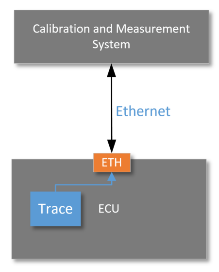 在上圖中,Trace 數據通過 Trace 模塊存放在 SRAM(作為臨時 Buffer) ,CPU 僅需觸發 DMA 搬運數據到 ETH 模塊,通過 Ethernet 與標定測量系統進行數據傳輸,雖然會消耗很少部分 CPU 資源,但是相較于之前 MCU 從通用性和成本上確實提升了不少。