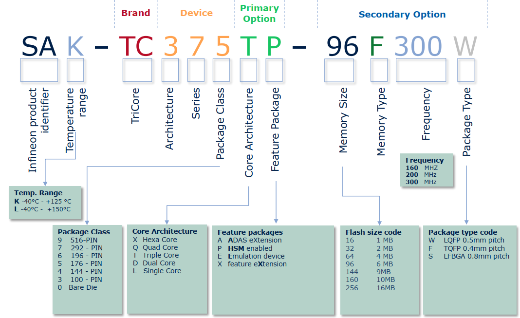 AURIX? 2G芯片從TC32X一直到旗艦的TC39X,覆蓋多個性能和功能區間,給用戶提供了較大的選擇空間。下圖是該系列芯片的官方命名規則: