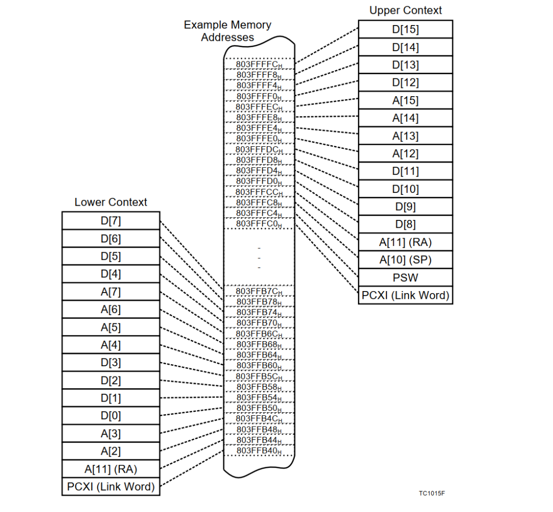 TriCore內核獨創了一種上下文保存機制,采用獨立的Context Save Area(CSA)內存區域,將函數調用、中斷、Trap等的上下文(寄存器、返回地址、PSW等)與棧進行隔離,大大提高了上下文的安全性。而且利用硬件自動保存、讀取的機制,很大程度上提高了系統的實時性。