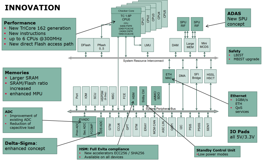 MCU芯片包括CPU(內核)、輔助核、總線、存儲系統、外設以及外部接口等,是計算處理和交互的總和。因此除了內核架構以外,芯片的架構設計也至關重要。下圖是英飛凌官方的芯片架構示意圖: