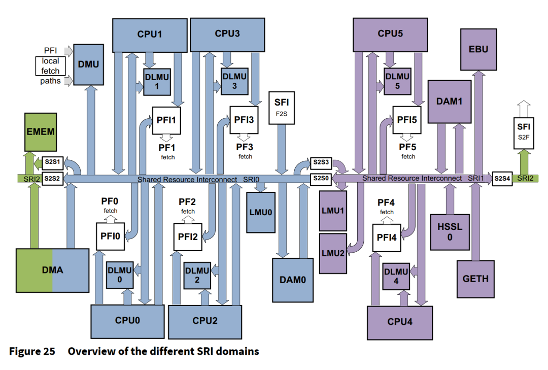 我們通過上圖來介紹TC3xx SRI總線結構。首先在6核架構中,前4個核及其耦合的內存連接到SRI0中,剩余兩個核則連接到SRI1中。SRI0和SRI1通過S2S進行橋接。對于核內耦合的DSPR、PSPR和PFlash,通過本地總線接口進行訪問,如果跨核則需要通過SRI總線。