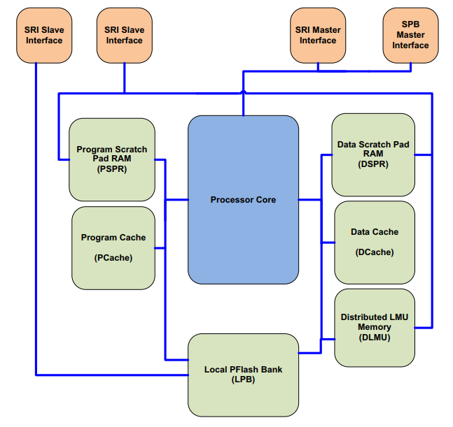 TC3xx系列的內存系統采用的是內核耦合設計,以上4種內存類型,每個核都有配套。