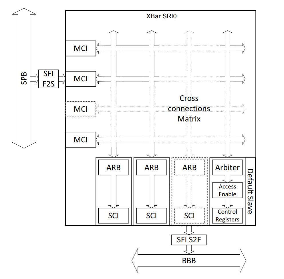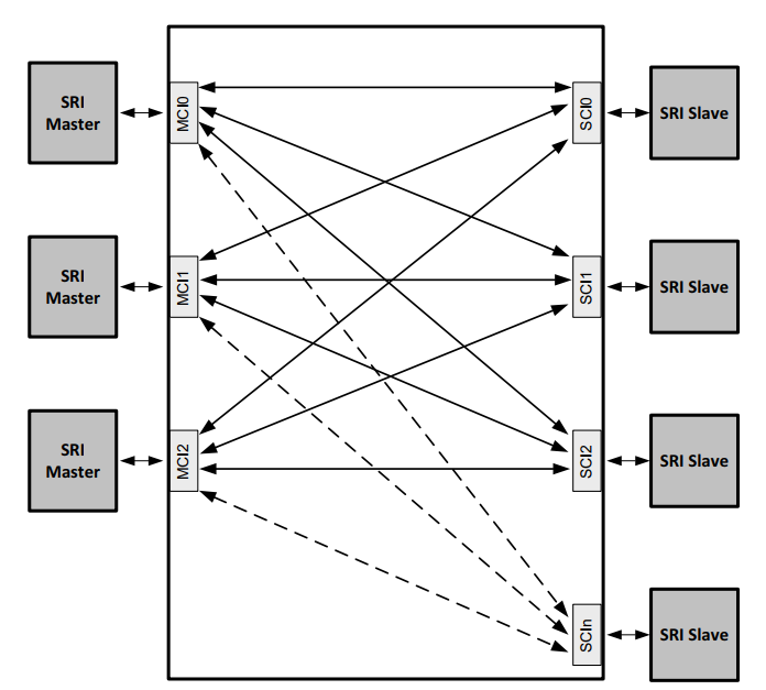 SRI為Master提供了Master Connection Interfaces(MCI)接口,用于連接Master與SRI總線,對于Slave則提供了Slave Connection Interfaces(SCI)接口。SRI總線負責進行從設備的訪問仲裁,以在多Master同時訪問Slave時解決沖突。其連接關系如下圖所示: