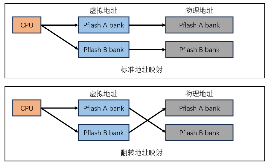OTA(Over-The-Air,空中升級)技術當今已經逐漸普及,這就要求MCU具有與之匹配的特性。TC3XX提供了一種A/BSwap的無感升級方案,在物理上將Flash分區A區和B區,升級時升級備份分區,然后由Flash硬件進行地址映射翻轉,實現對于App無感的升級方案。此方案下App無需進行地址適配,升級失敗也能維持原有版本的運行。