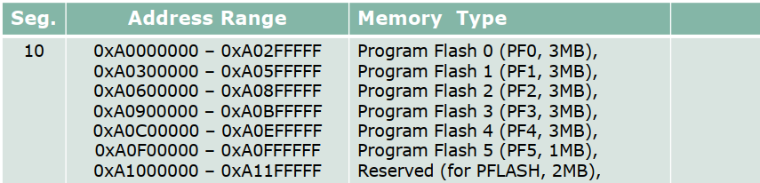 對于Programe Flash,則位于以0x8000 0000起始的區域,比如PFlash0位于0x8000 0000,PFlash1位于0x8030 0000,依此類推。