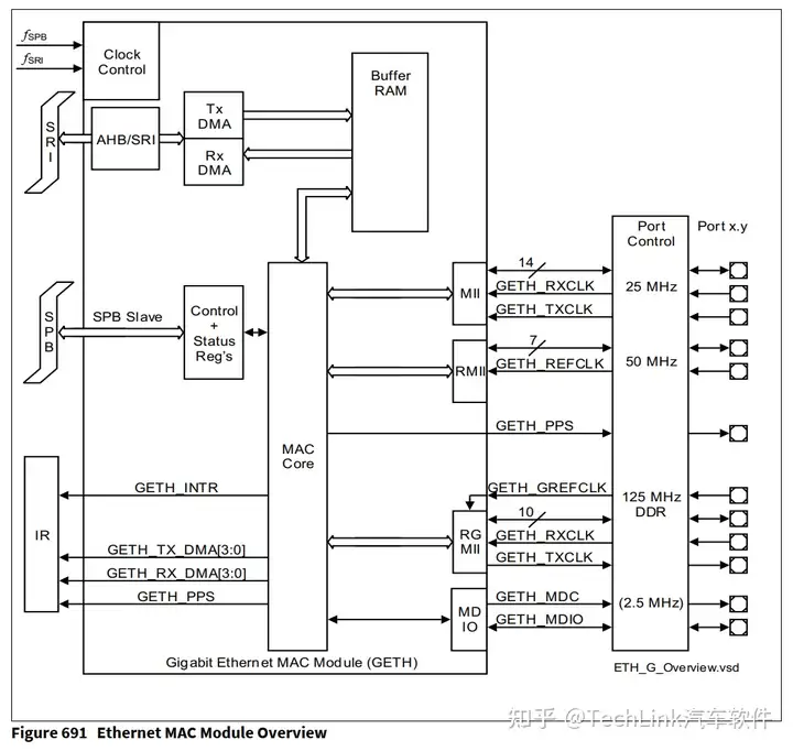 從圖中我們可以看出,和其他片內外設一樣,MCU內部通過SRI數據總線,與GETH模塊進行以太網數據,通過SPB總線進行GETH模塊寄存器設置。GETH同樣和IR模塊進行交互,以進行中斷路由處理。