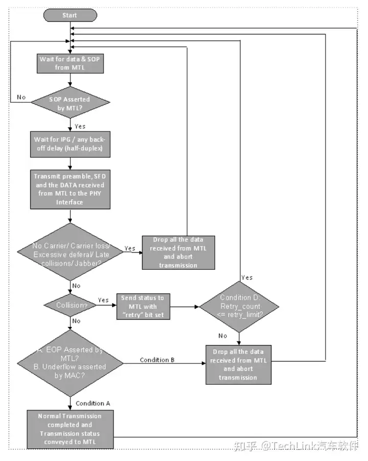 當MTL將數據發送到MAC,并同時拉高SOP信號線,則視為啟動一次發送,此時MAC開始將數據發往MII或者GMII。然后中間有一系列延時、ACK等邏輯完成MTL向MAC的數據發送,最后MTL拉高EOP信號線,視為MTL傳輸完成。如果是全雙工模式,意味著這一包發送完成了;但是如果是半雙工模式,MAC層還需要進行載波偵聽和碰撞檢測,以防止總線Busy的時候發包失敗,并進行重發流程。MAC層的發送流程如下圖所示: