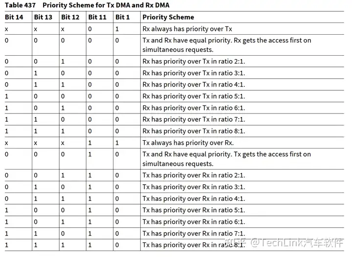 Fixed-Priority Arbitration:當寄存器DMA_MODE.DA被設置為1,DMA_MODE.TXPR為0時,則接收的優先級永遠高于發送;如果DMA_MODE.TXPR為1時,則仲裁規則按照下表實施;