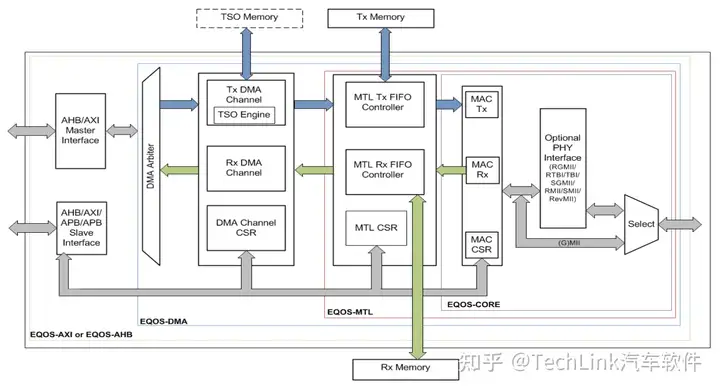 該圖和前面的類似,只是進行了內部拆解,最外層AHB Master接口接到英飛凌的SRI總線上,供DMA進行數據讀取和寫入;AHB Slave總線接入到英飛凌的SPB總線上用于MCU對GETH模塊的控制。第二層EQOS-DMA主要包含DMA硬件,包括仲裁單元。第三層EQOS-MTL是傳輸層,用于組包拆包(不是TCP)。最后一層是EOQS-Core,就是模塊的內核,負責數據的最下層收發處理。本節我們分別介紹這些模塊的結構和功能。