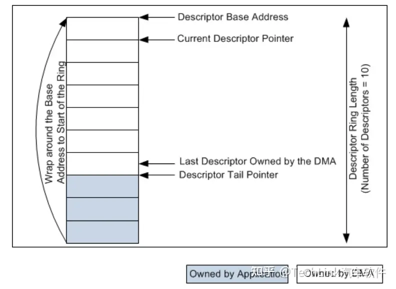 雖然雖然手冊上說一個描述符可以指向至多兩個Buffer,且可以把MAC幀的Header和Payload分開存放,但是實際使用過程中,包括MCAL相關的代碼及配置,都是一個描述符指向一個Buffer,多個描述符組成一個RingBuffer結構,如下圖所示。