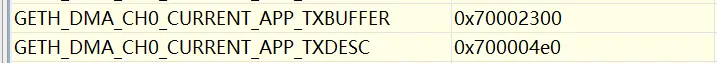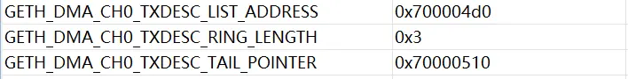 我們可以看到當前CURRENT_TXDESC指向的是第二個描述符,也就是說我們要發送數據的話就使用這個描述符。然后TXDESC_LIST_ADDRESS指向第一個描述符,TXDESC_RING_LENGTH為3表示配置了4個描述符。當我們向TXDESC_TAIL_POINTER寫入尾部地址時,DMA會輪詢從CURRENT_TXDESC到TXDESC_TAIL_POINTER(左閉右開)的所有描述符,執行發送操作。當然只有第二個描述符的DMA歸屬位置位了,到第三個時DMA會自動Suspend,詳細流程我們后面再討論。