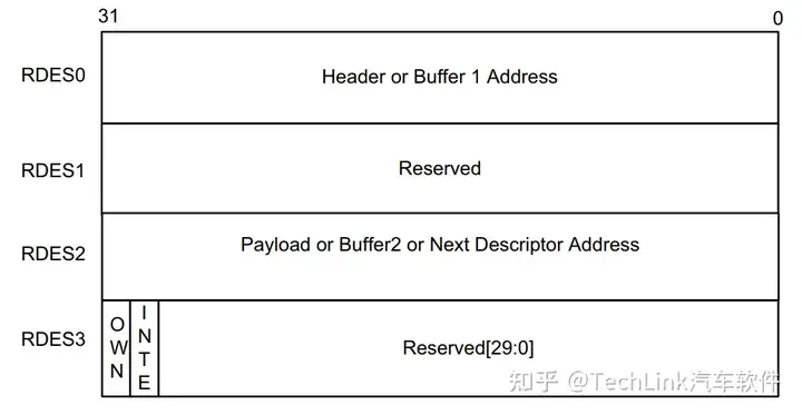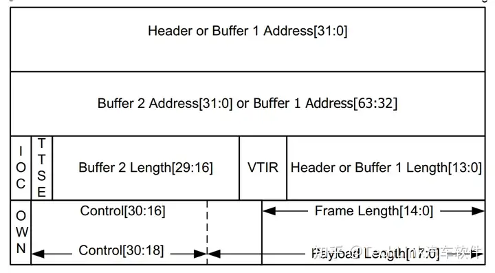 OWN(31):DMA控制權標志位,該位置位表示DMA擁有該描述符的控制權,它會去讀取相應的Buffer,并回寫該描述符,并將該位清除;