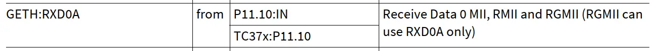 Aurix TC3XX系列支持MII、RMII、RGMII等媒體獨立接口,從圖中我們可以看出,它們作為可選接口出現,通過Port與外部相連。另外部分中低型號是不支持RGMII的,選型時需要注意。