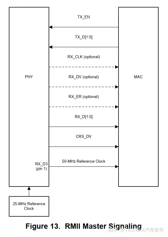 下面我們以RMII接口為例,來介紹如何查詢接口引腳,以進行相關配置。我們先來看RMII的引腳定義,下圖是DP83825i的RMII Master信號定義,本文只關注MAC這一側: