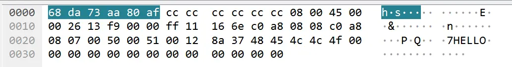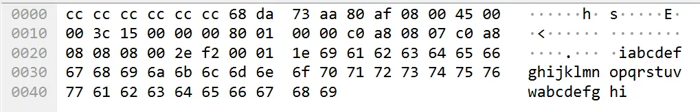 然后我們觀察數據包,內容同上(以太網最小64字節,多出的8字節0為填充):