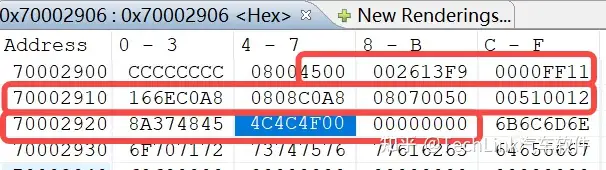 我這里使用的是發送UDP報文,發送Buffer地址為0x70002906,Buffer數據長度為38個字節,僅包含網絡層內容,內存如下: