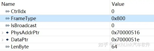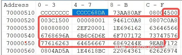 傳參這里幀類型為IPv4的0x0800,源MAC地址存在0x70000516,數據地址為0x7000051E,數據長度為64字節,這里起始GETH硬件是將MAC幀整包傳上來的,從0x70000510開始,只是函數接口形式將包進行了拆分: