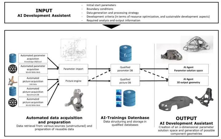 汽車行業受到各種內部和外部邊界條件變化的影響,這使得汽車開發和生產流程必須不斷調整。特別是在開發流程領域,過去幾十年間,從繪圖板上的二維圖紙向結合優化方法(如同步工程和前期加載)的三維計算機輔助設計(CAD)模型在虛擬產品開發中的應用轉變,成為了一個變革性的因素。然而,如今這些方法在優化能力和資源節約潛力方面已達到極限。因此,在汽車開發流程中引入基于 AI 的技術是實現進一步優化的合理下一步。