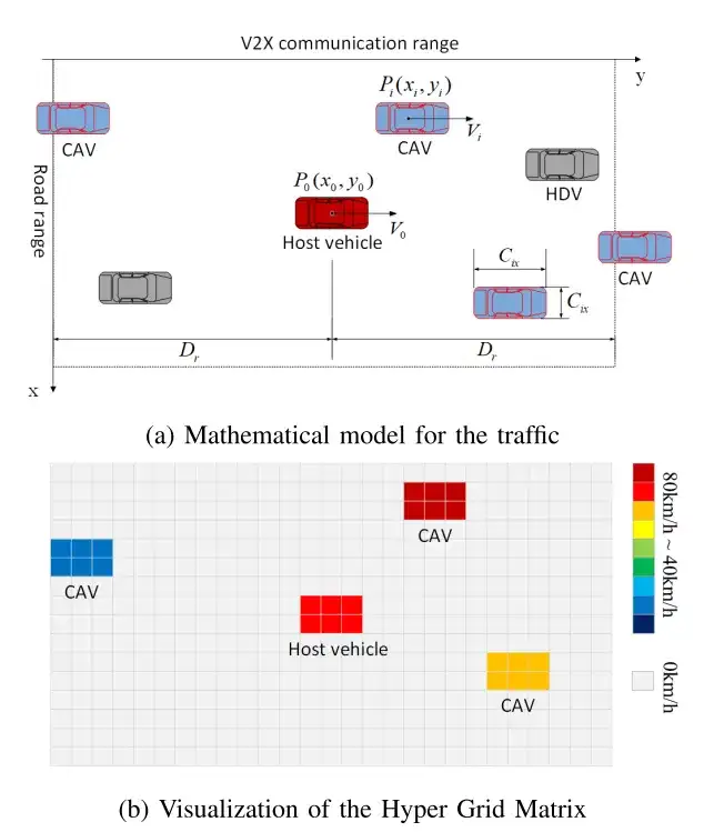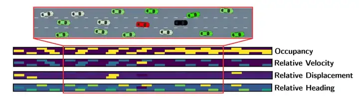 在網格中表示移動物體(即周圍車輛)不僅需要占用信息,還需要其他信息,因此空間網格的單元格需要包含額外信息。文獻中,作者使用等距網格,自車位于中心,其他車輛占用的單元格表示對應車輛的縱向速度(見圖 7)。文獻中也采用了相同的方法。自然地,這種簡單表示無法提供其他交通參與者的橫向運動信息,但比僅基于占用的表示提供了更多信息。等距網格是通用環境的合理選擇,其中移動機器人的移動方向不受限制,但對于道路車輛而言,車輛主要沿交通流方向行駛。在這種情況下,可以選擇固定于道路拓撲結構(即道路車道,無論其曲率或寬度如何)的空間表示。在這些基于車道的網格解決方案中,表示高速公路的網格行數與實際車道數相同,車道沿縱向離散化。文獻中展示了這種方法的最簡單應用,其中單元格長度等于單位車輛長度,交通行為類似經典的基于元胞自動機的微觀模型。
