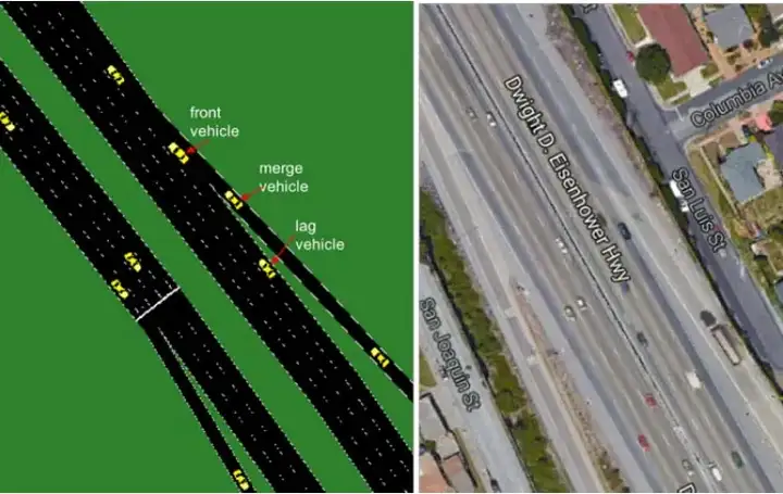 在匯入場景中,最復雜的是雙匯入場景:兩條多車道高速公路交匯后又分離,智能體從兩個入口駛入,也從兩個出口駛出。該問題的首次研究是文獻中提出的 CM3 算法示例,其中兩個人工智能控制的智能體在 SUMO 仿真器中與其他周圍車輛一起執行這種匯入動作。由于雙匯入問題具有相當大的危險性,使用簡單的強化學習技術難以解決。文獻中,基于策略梯度(PG)的學習器提供縱向和橫向期望目標,但由基于規則的監督系統確保其安全性。