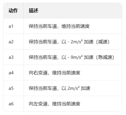 在行為層制定決策至少包括三個離散動作:保持當前車道、向左變道和向右變道,如文獻所示。在該論文中,作者將自車的速度和車道位置的真實狀態信息,以及八個周圍車輛的相對位置和速度作為觀測空間。他們在三種觀測噪聲類別(無噪聲、中等噪聲(5%)和高噪聲(15%))下訓練和測試智能體,并表明在噪聲較高的訓練環境中訓練出的智能體性能更穩健可靠,且通過使用帶有 tanh 激活函數的、隱藏層為 64、128、128、64 的深度 Q 網絡(DQN),其性能也優于基于規則的 MOBIL 模型。在非常相似的環境和觀測空間中,文獻使用了更廣泛的動作集合來執行車道變換(包括先前的加速或接近目標車距),產生了六種不同的動作(見表 2)。他們還得出結論,使用兩個卷積層和一個全連接層的深度 Q 網絡(DQN)智能體的性能與基于智能駕駛模型(IDM)和模型的參考模型相當或更優。在同一作者的另一篇論文中,動作空間略有變化,將加速指令改為增加和減少自適應巡航控制(ACC)設定點,并讓底層控制器執行這些動作。