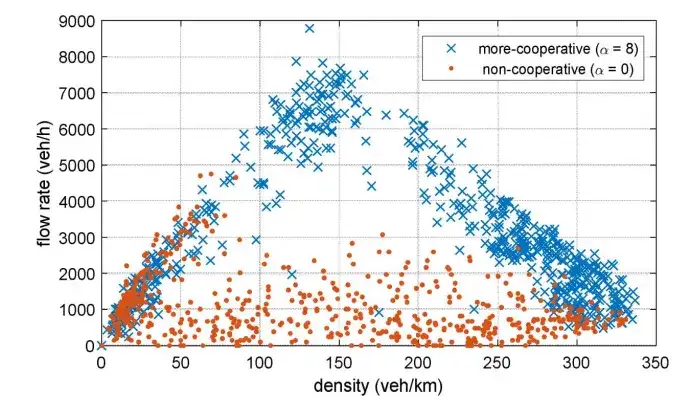 自動駕駛中的一個有趣問題是訓練智能體的合作行為。文獻中,作者考慮了三車道高速公路場景,使用基于車道的網格表示作為觀測空間,并使用包含四個動作的簡單元組(左、右、加速、無動作),通過獎勵函數實現合作和非合作行為。獎勵函數中不僅考慮了自車的經典性能指標,還考慮了周圍交通的速度(這自然會受到智能體行為的影響)。底層網絡使用兩個卷積層(16 個大小為(2,2)的補丁濾波器,采用 ReLU 激活函數)和兩個全連接層(每個層有 500 個神經元)。為了評估合作行為的影響,作者通過仿真中的虛擬環路收集交通數據,并在經典的流量 - 密度圖中可視化由此產生的交通性能(見圖 12)。結果表明,合作行為導致更高的交通流量,從而提高了高速公路容量并減少了整體行駛時間。
