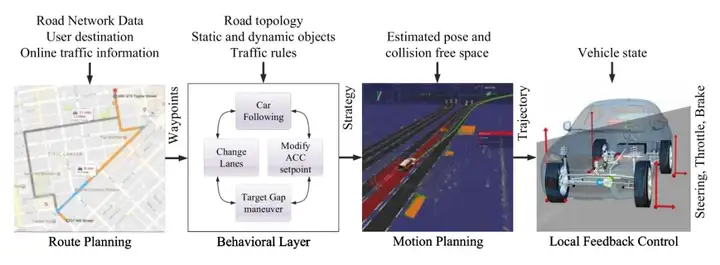 將深度神經網絡應用于自動駕駛汽車,有望開發出 “端到端” 解決方案。該系統的工作方式類似人類駕駛員:輸入包括行駛目的地、道路網絡知識和各種傳感器信息,輸出則是直接的車輛控制指令(如轉向、扭矩和制動)。然而,一方面,實現這種方案相當復雜,因為它需要處理駕駛任務的所有層級;另一方面,系統本身如同一個黑箱,這會引發設計和驗證方面的問題。從該領域近期的進展來看,大多數研究集中于解決分層運動規劃問題的某些子任務。如文獻所述,自動駕駛的決策系統至少可分解為四個層級(見圖2)。