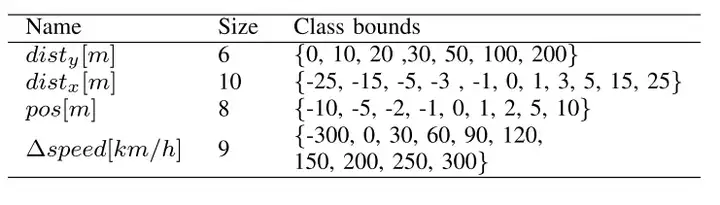 狀態表示包括兩輛車的縱向和橫向距離、自車的橫向位置以及兩輛車的速度差。作者將該狀態空間離散化為大小分別為(6, 10, 8, 9)的類別(見表 1),并使用最小的橫向動作集合(大小為 3),動作包括向左或向右偏移 1 米以及保持橫向位置。綜上,該問題生成的 Q 表包含 6×10×8×9×3=12960 個元素。盡管如今這樣大小的表格可以輕松處理,但不難想象,對于更復雜的問題(涉及更多車輛、更多傳感器、復雜動力學、更密集的狀態和動作表示),Q 表的大小會變得極其龐大。一種可能的簡化方法是利用多目標強化學習方法,將整體問題分解為子任務,文獻中就采用這種方法解決超車機動問題。在后續研究中,作者擴展了該問題,將駕駛問題分解為避撞、目標追蹤、車道保持、車道選擇、速度保持和穩定轉向等任務。為了減小問題規模,文獻的作者使用戰略層級決策為車輛設定相對于周圍車輛的運動目標,并將低層級控制留給經典解決方案,這顯著減小了動作空間。