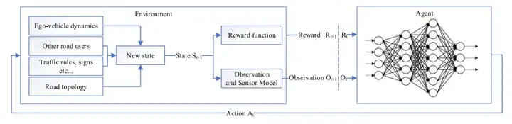 Ω 是智能體在環境中可獲得的觀測集合,而 O 是觀測函數,它給出了可能觀測的概率分布。在較簡單的情況下,研究假設完全可觀測性,并將問題表述為馬爾可夫決策過程(MDP),但在許多情況下,車輛并非擁有所有信息。另一個有趣的主題是狀態觀測的表示,這是深度強化學習智能體架構選擇和性能的關鍵因素。文獻中使用的觀測模型將在第二節第五部分進行總結。