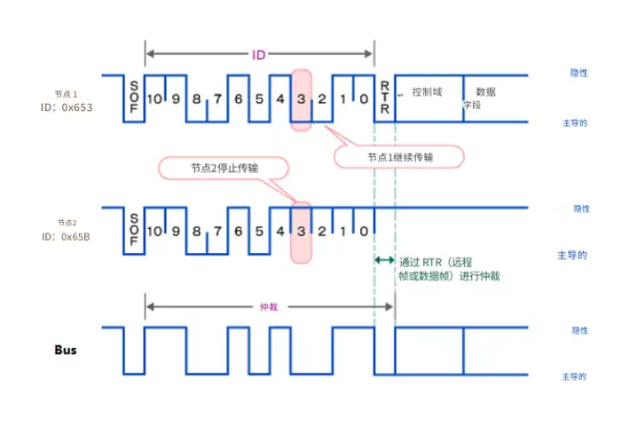 當不同節點同時發送顯性和隱性信號時,顯性信號優先,總線狀態變為顯性狀態。在這種情況下,發送隱性信號的節點會檢測到自身信號與總線狀態存在差異,導致通信仲裁失敗,并停止發送信號。