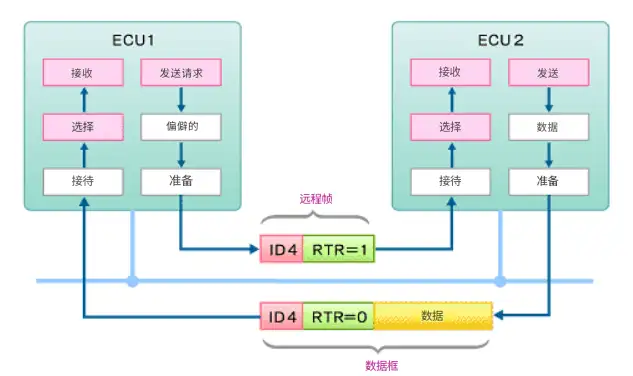 CAN 總線的基本通信方法是:需要數據的節點發送遠程幀,相應的節點以數據幀進行響應。遠程幀請求數據,數據幀則返回響應請求的數據(圖 4)。