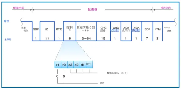 RTR 之后是“控制字段”,它由保留位 r1 和 r0(均為 1 位)以及 4 位“ DLC(數據長度代碼) ”組成。在標準格式中,保留位 r1 和 r0 都被固定為顯性位。