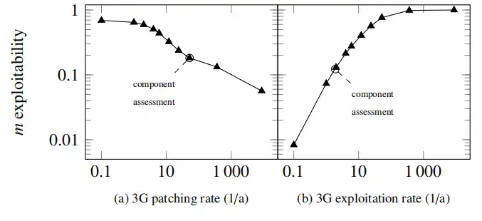 圖 6、參數探索示意圖,用于評估(參數)對整個架構安全性的影響。(a)中對入口點的補丁更新率進行了調整;(b)中為構成車輛攻擊起點的遠程信息處理電子控制單元(3G)采用了不同強度的安全防護措施