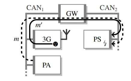 圖 1、汽車架構中可能存在的漏洞利用示意圖。正常運行狀態下,泊車輔助系統(PA)會通過網關(GW)發送消息流 m,以此實現對動力轉向系統(PS)的控制。若遠程信息處理模塊(3G)遭遇黑客攻擊(-),攻擊者可發送一條標識符與 m 完全相同(ID (m) = ID (m′))的消息流 m′,進而實現對轉向系統的控制