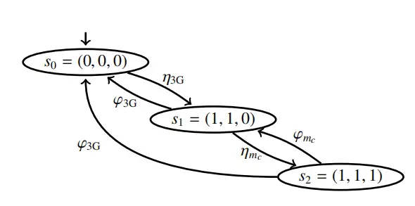 示例:為了說明這一過程,考慮一個簡單的架構 —— 遠程信息處理電子控制單元(3G)連接到 CAN 總線(參見圖 1 中的 3G)。CAN 總線用于傳輸消息 m,該消息既不由遠程信息處理電子控制單元發送,也不被其接收。將該架構轉換為馬爾可夫模型后,得到如圖 3 所示的模型。這是一個非常簡化的轉換,未考慮所有電子控制單元、接口或消息狀態,且每個模塊僅考慮一個漏洞。