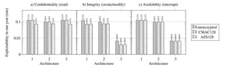 圖 5、圖 4 所示架構的分析結果。我們針對三種架構,結合不同的保護機制(未加密、128 位 CMAC、128 位 AES),從機密性、完整性和可用性三個維度對消息 m 進行了分析。結果清晰表明,更優質的加密方式和設計更嚴謹的架構具有更低的被利用風險;而在可用性方面,需要總線系統的支持才能確保合理的安全性